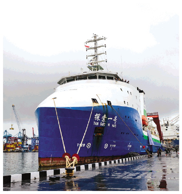 这是3月22日在印度尼西亚雅加达拍摄的停靠在丹戎不碌港的“探索一号”科考船。 新华社记者徐钦 摄