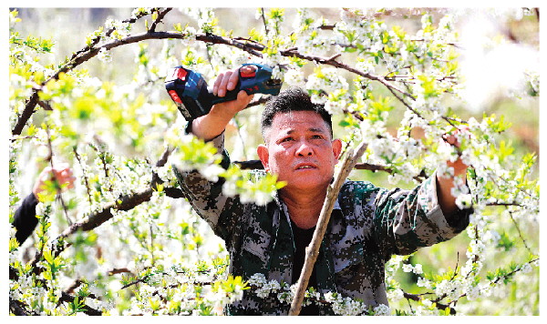 在灌阳县文市镇大湾村,当地柰李种植户正在管护花枝。