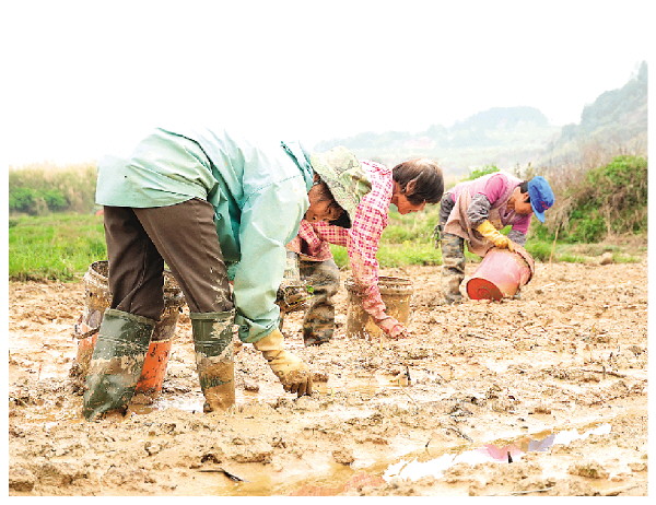 本报讯(记者何月 通讯员覃茜)在平乐县阳安乡久宜村,开阔的水田里20余名妇女弯着腰种下芋苗。去年这里还栽种着莲藕,今年这一片已经被宾小波承包下来改种香芋。