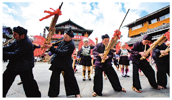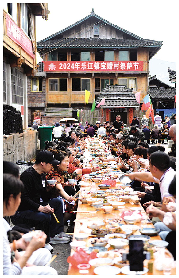 本报讯(记者李忠波 通讯员潘志祥 黄同凯 文/摄)3月24日,龙胜各族自治县乐江镇宝赠村迎来一年一度的传统“祭萨节”。当地侗族民众身着节日盛装欢聚一堂,吹起芦笙、弹起琵琶歌,通过开展原生态歌舞展演、民俗巡游、喝平安粥、吃侗家合拢宴等独特的方式全面展示侗族的服饰文化、歌舞文化、饮食文化和礼俗文化,吸引了众多游客前来探秘古朴而神秘的原生态民族文化。