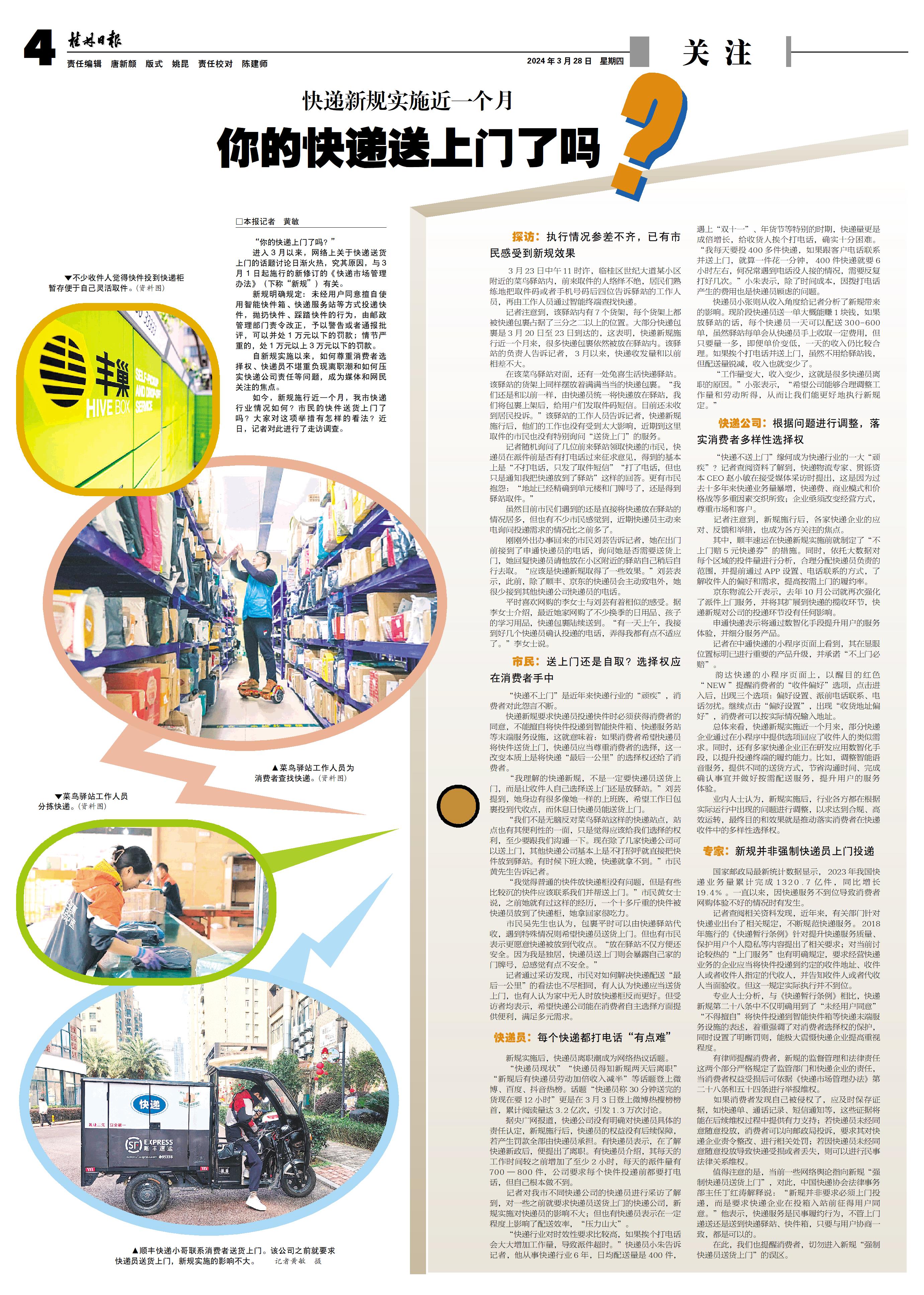 记者注意到,新规施行后,各家快递企业的应对、反馈和举措,也成为各方关注的焦点。