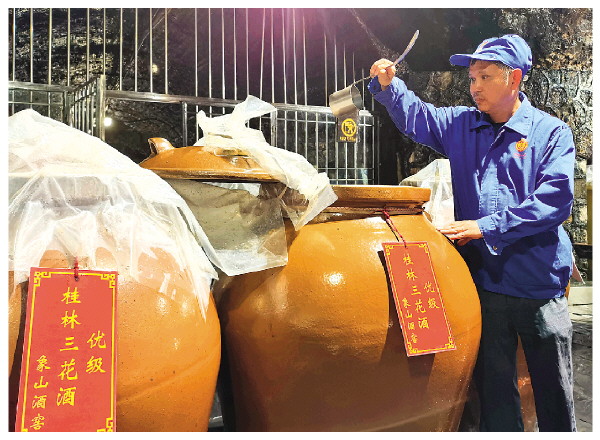 漓水南流,孕育桂林三花酒 近日,记者来到位于象鼻山岩洞内的桂林三花象山酒窖,一股酒香扑鼻而来,一个个装满不同年份三花酒的大酒坛存放在此。 桂林三花股份有限公司技术质量部经理李勇介绍,自古以来,象鼻山附近的酒坊将酒藏于岩洞中,洞中冬暖夏凉,常年保持在20摄氏度。如今,象山酒窖贮藏了数千吨自20世纪50年代以来不同年份的陈酿桂林三花酒。 李勇说,桂林三花酒沿用古法酿造,首先,用本地大米进行蒸米。其次,蒸熟后的米进行摊凉,过去是用簸箕摊凉,现在用凉饭机。接着是糖化、舀糟和发酵三个环节,糖化和发酵环节一般需要7至15天。再次,发酵物成熟后进行蒸酒,原酒经过检验后根据品质分为低、中、高三个等级,中、高品质的酒进入象山酒窖存放,低端品质的则进入厂区库房存放。存放一段时间后,各品质酒再灌装出厂。 米香型白酒作为我国传统基本香型白酒,有悠久的历史和丰富的文化内涵,是众多专家考证公推为起源最早的蒸馏酒,广西是主要产区,而桂林是核心产区。 据《临桂县志》记载,桂林酿酒业已有一千多年的历史,早在唐宋时期,桂林的酿酒业已十分发达。唐代诗人宋之问在《桂州三月三日》一诗中写道:“始安繁华旧风俗,帐饮倾城沸江曲。”诗中记述了桂林三月“帐饮倾城”的盛况。 清朝咸丰年间,广东人曾厚堂在桂林兰花池畔建起“安泰源”酿酒糟坊。其酿制工艺需蒸熬三次,称为“三熬酒”。在成品酒的质量鉴定上,以起花多、酒花细、堆花久为佳,遂又起名“三花酒”。三花酒制成后需要装入陶缸,存放在石山岩洞中陈酿1至2年,使酒质更加醇和、芳香。 抗战时期,作为大后方的桂林人口从3万暴增到30多万,促使酿酒业迅速发展。当时,仅三花酒糟坊就有40余家,加上兼营的超过百家,月产量15万千克左右。新中国建国前夕,百年老字号酒坊如“安泰源”“品冽”“胡裕兴”“源生祥”等有数十家。其中以“安泰源”所生产的三花酒名气最大,畅销梧州、广州、香港、澳门和东南亚一带。 1952年10月,市人民政府将“安泰源”“品冽”等几家桂林的百年老字号酿酒作坊合并,组建了“桂林酒类专卖事业处附属酿酒厂”。1953年3月,该厂改为地方国营“桂林酿酒厂”。1958年6月改名为“桂林饮料厂”。1987年更名为桂林市酿酒总厂。 上世纪90年代起,顺应改革大潮,桂林市酿酒总厂实施了股份制改革,改革为国有控股企业桂林三花股份有限公司。2000年,公司进行二次改制,成为员工持股的民营股份制企业,基本建立现代企业制度。 治理结构、薪酬体制、营销模式、产品开发方式的转变,让企业焕发出前所未有的激情活力,桂林三花展开腾飞之翼。 1992年,桂林三花酒荣获国际食品博览会金奖,并被市政府认定为“桂林三宝”之一。1999年,桂林三花荣获“中华老字号”称号。2008年,“桂林三花酒传统酿造技艺”被列入广西非物质文化遗产名录。2023年10月,在第十九届中国国际酒业博览会上,桂林三花的产品“53°桂林三花·回味1952”以其优秀品质荣获金奖。 经过70多年努力,桂林三花已成为广西规模最大、实力最强、设备技术最先进的米香型白酒生产企业。 近年来,桂林三花还打造了“新春象山酒窖开窖节”,在每年活动期间,象山酒窖对市民免费开放,让消费者近距离探秘象鼻山得天独厚藏酒宝库,并打一壶桂林三花酒过年,体验中国米香文化。