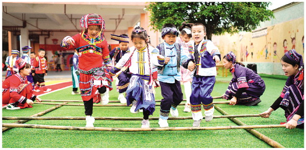 “三月三”临近,定江镇中心幼儿园的小朋友们身着民族服装,开展跳竹竿舞、抛绣球、对山歌、品美食等丰富多彩的民俗体验活动,迎接传统节日的到来。