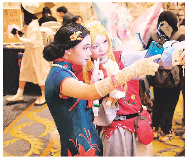 七星区“三月三”动漫嘉年华拉开帷幕后,漫友们身着动漫角色服饰,在桂林香格里拉大酒店的动漫周边市集上打卡。
