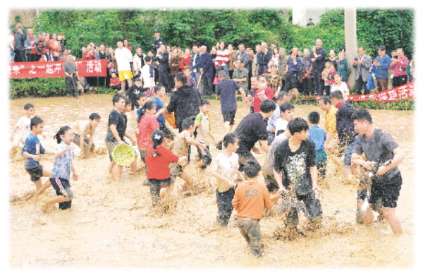 4月11日,永福县百寿镇举办2024年“潮聚三月三 相约寿城来”民俗系列活动,包括百寿岩的送福添寿、品丹泉尝神果;春游十里花河、汉服出行、歌圩会、“大家一起冲鸭”、“浑水摸鱼”;东岸村“福”字石刻揭幕仪式、新隆村风雨桥长桌宴等,充分展现了该镇近年来将百寿岩、古城墙、海菜花等人文景观、自然风光与新型城镇化建设相结合所打造的养生文化旅游小镇独特魅力。图为“大家一起冲鸭”活动现场。