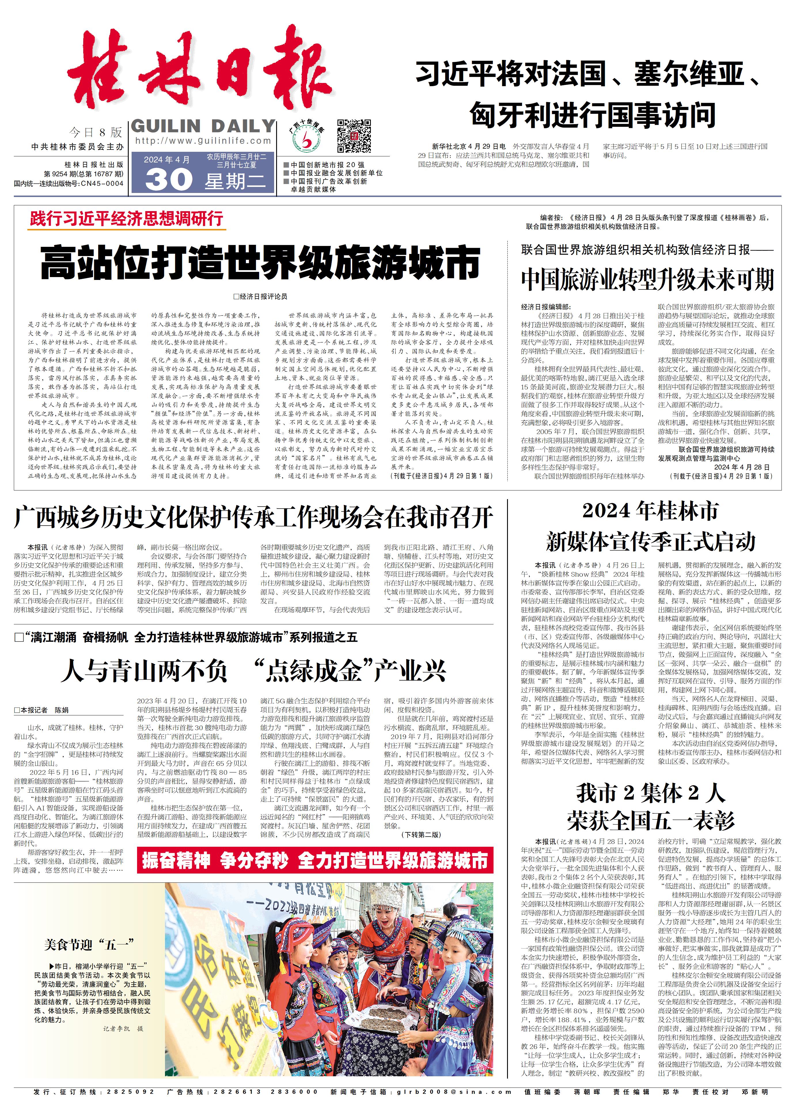 《经济日报》4月28日推出关于桂林打造世界级旅游城市的深度调研,聚焦桂林保护山水资源、创新旅游业态、发展现代产业等方面,并对桂林加快走向世界的举措给予重点关注,我们看到报道后十分高兴。