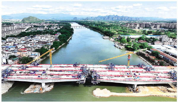 5月5日,航拍正在建设的净瓶山大桥。据悉,新建净瓶山大桥项目主桥为四幅三跨变截面连续桥梁,整座大桥全长320米,宽50米。1月31日,大桥右幅辅道桥现浇箱梁完成合龙浇筑。经过3个多月的奋战,四幅桥即将全部合龙。记者唐艳兰 摄