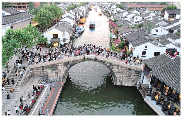 5月2日,游客在大运河江苏无锡段的清名桥历史文化街区游览(无人机照片)。