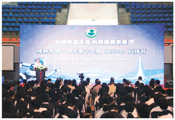 在21世纪这个知识爆炸的时代,科学技术无疑是推动社会发展的核心动力。培养具有创新精神和实践能力的科学人才,不仅是国家实现繁荣富强的战略需求,更是顺应时代发展潮流的必然选择。 桂林市第一中学(以下简称“桂林一中”),前身是1937年创建于南京的国立汉民中学,作为一所具有深厚文化底蕴和悠久办学历史的名校。近年来,桂林一中坚持以习近平新时代中国特色社会主义思想为指导,全面贯彻党的教育方针,紧密围绕“立德树人”这一根本任务,秉承“严明治校,五育并举,以人为本,和谐发展”的办学理念,积极探索“科技见长,体教融合”的育人特色,致力于培养全面发展的创新人才。 今年1月31日,教育部办公厅公示了全国中小学科学教育实验区、实验校名单,桂林一中赫然在列,成功入选首批全国中小学科学教育实验校。这一荣誉的获得,不仅是对桂林一中多年来在科学教育领域不懈探索和努力的肯定,也标志着学校科学教育事业迈向了新的发展阶段。 桂林一中是如何将科技教育特色建设逐步提升为以培养学生科学与技术素养为终极目标、以科学探究的思想统领相关学科课程教学和科技类校园活动的新格局,实现学校跨越式发展的呢?或许,我们可以从该校一年一度开展的科技节上找寻答案。 桂林一中,作为广西壮族自治区示范性普通高中和自治区首批“科技创新人才培养”特色高中,在被教育部列为全国首批科学教育实验校后,其今年举办的科技节备受社会各界广泛关注和瞩目。在4月30日举行的“桂林市第一中学第十五届科技节”开幕式上,来自教育部科学教育领域专家、大学学者,市教育局、市科技协会领导代表以及我市全国科学教育实验区、实验校的校领导和老师们汇聚一堂,各抒己见,深入探讨交流了桂林一中在深化科学教育改革与建设、探索科技教育新模式、培养科技创新人才的有效实施途径与经验分享及其应用成果,共绘学校发展新蓝图。 桂林一中校长李山涛在致辞中表示,科学教育的核心在于启迪思考、鼓励发现,并培养学生独立解决问题的能力。学校坚持“崇尚科学、追求真理、勇于创新、启迪智慧”的科学教学理念,不断深化科学教育改革,探索科技教育新模式,致力于打造一个促进学生创造力和实践技能提升的平台,培育和提升学生的探索精神和科学素养,培养更多科技创新型人才。 桂林市科学技术协会主席梁劲认为,在新一轮科技革命和产业变革中,在全国加快形成新质生产力的大潮中,桂林一中准确地把握住新时代科学教育的重点,全面积极地展示出学校的担当与作为,在激发学生崇尚科学、探索未知的兴趣、提升青少年科技创新水平等方面发挥出重要而积极的促进作用。 教育部科学教育专家、广西师范大学罗星凯教授指出,本届科技节的举办,不仅仅是因为能够见证年轻一代对科技的热情和探索,更因为这标志着桂林市全国科学教育实验校进一步的实践与深化。他表示,全国科学教育实验校的建立,就是为了构建这样一个平台——它既能提供丰富的科学教学资源,又能激发学生们的探究欲望,最终培育出能够适应未来社会需要的科学人才。一个优秀的科学教育实验校,应当成为学生发现问题、解决问题的乐园,让他们在实践中学习,在挑战中成长。相信桂林一中在推进学校科学教育,发展学生素质,提升教师素养,创新课程教学,改革育人方式,完善评价机制,拓宽学生国际视野等方面一定会走得更远,飞得更高。 桂林市教育局副局长蒙亮强调,桂林一中是我市探索中小学科学教育工作的引领者和首批全国科学教育实验校。学校始终秉承着培养创新精神和实践能力的教育理念,致力于为学生提供一个广阔的科学探索平台。每年定期组织举办的学校科技节活动就是对这一理念的最好诠释。会上,她向全市学校和广大教育工作者发出倡议,让我们携起手来,共同推进科学教育的深入发展,走特色化、多样化发展之路。 随后,校党委书记李山郑重宣布:“桂林市第一中学第十五届科技节正式开幕。”各项活动和赛事如火如荼地在校园开展起来。 本届科技节主题是“科技创造生活 科教成就未来”,通过专家讲座、科学实验、竞赛比拼、互动体验等形式在校园各处有序开展。竞赛项目设有“鸡蛋保护器设计比赛”“空运乒乓球”“简易小喷泉制作”“自制豆腐”“细胞模型制作与展示”“自制简易乐器及演奏”“3D建模创新赛”等。 活动中,特邀嘉宾、桂林电子科技大学俞兆喆教授以其深厚的学术造诣和前瞻性的科技视野,为在场的师生们带来了一场震撼人心的科普讲座《中国科技进展与世界科技发展态势》。他以生动的语言详尽地分析了世界科技发展的最新态势,分别介绍了在新一轮的科技革命和产业变革中,中国科技在航天科技、新能源、半导体等各个领域的最新进展和成就,为同学们开启了一个了解中国与世界科技发展态势的窗口,进一步激发出在座师生们对于科学的热爱和追求。 在本届科技节各个活动现场,在这一个充满无限想象与智慧创新的大舞台上,桂林一中学子敢于想象、勇于尝试、富于创新,活学活用,在比赛中温故而知新,于交流探讨中成长进步。他们正用灵巧的双手和活跃的大脑在声、光、电、磁中往来穿梭,通过把所学的知识转化为能力,融会贯通,去发明、去创造,去探索知识的奥秘,去攀登科学的高峰