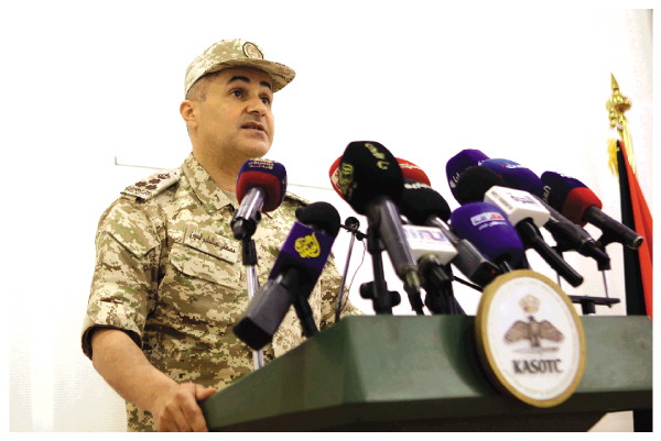 5月12日,在约旦首都安曼,约旦武装部队发言人穆斯塔法·希亚里在新闻发布会上讲话。 新华社发(穆罕默德·阿布·古什摄)