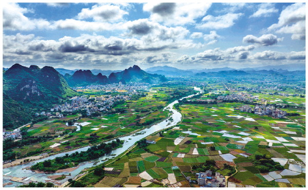 6月2日,荔浦市马岭镇广安村大绿水屯,蓝天白云绿水青山,一块块农田生机盎然,阳光穿过云朵,给田野打上光影,犹如一幅精心绘就的油画。夏天里的桂林乡村,开启了五彩斑斓的油画模式。记者何平江 摄