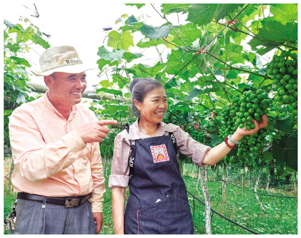 蒋秀芳夫妇看着长势良好的葡萄,笑容灿烂。 记者秦丽云 摄