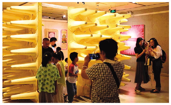 本报讯(记者韦莎妮娜)6月1日,“榴莲房——席华专题作品展”在桂林美术馆拉开帷幕。将近30件与榴莲相关的艺术品组成了这场“有味道”的展览。在一阵阵榴莲香味中,近千人怀着好奇心踏入“榴莲房”,看看艺术家是如何用丙烯、铝皮、吊床、交通锥、塑乳胶等物品,通过巧思组合创作出各种榴莲主题的装置作品。