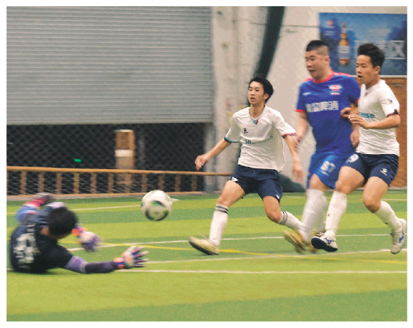 面对对手近在咫尺的攻门,海信队守门员倒地扑球。