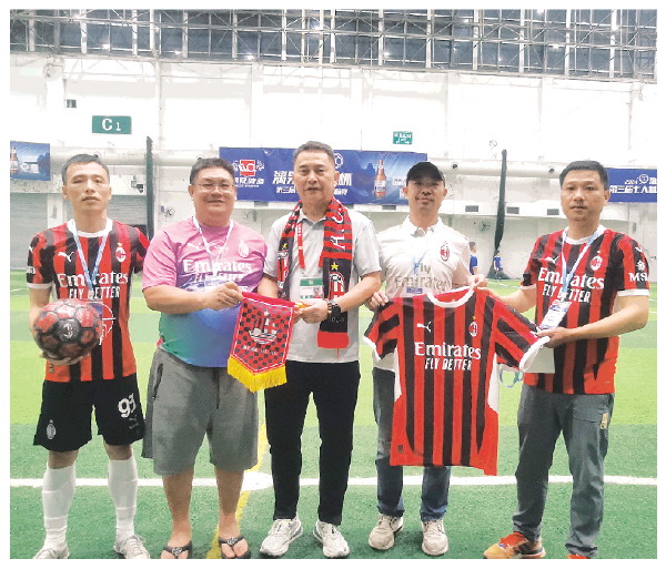 6月4日晚,在桂林AC米兰与廖哥土鲫鱼·天龍比赛前,桂林AC米兰队向桂林足协捐赠由球队全体球员签名的球衣以及队旗、足球等,表达对桂林足协举办桂林市第三届七人制足球赛的感激之情。 记者周文俊 摄