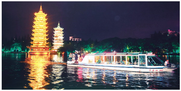 ◤6月7日晚,满载游客的游船在两江四湖上穿梭,游客们陶醉在桂林美丽的夜色中。