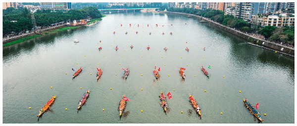 ◤6月9日,参赛队伍在赛前巡游(无人机照片)。