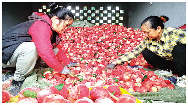 ▲灌阳县水车镇官庄村水果交易中心内,工人在分拣大红桃。 陆仕臣 摄