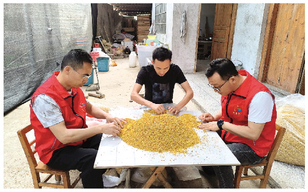 ▲胡世弼和驻村工作队员一起挑拣桂花共商以后创业方向。 黄炎宝 摄