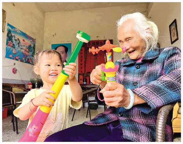 老人和曾孙女一起玩耍。 记者刘健 摄