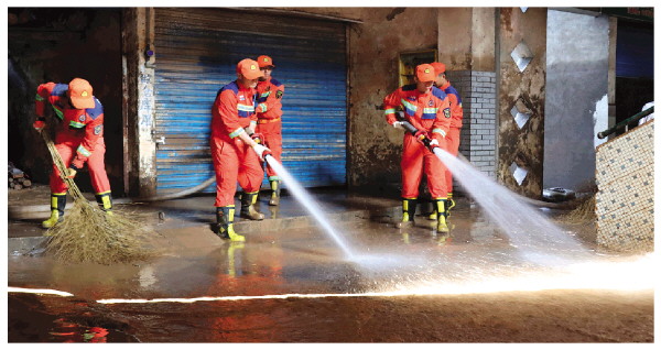 6月15日下午,在永福县西江市场,该县市场开发服务中心、消防救援大队、武警永福中队等多部门紧密合作,有条不紊地进行市场灾后恢复工作。