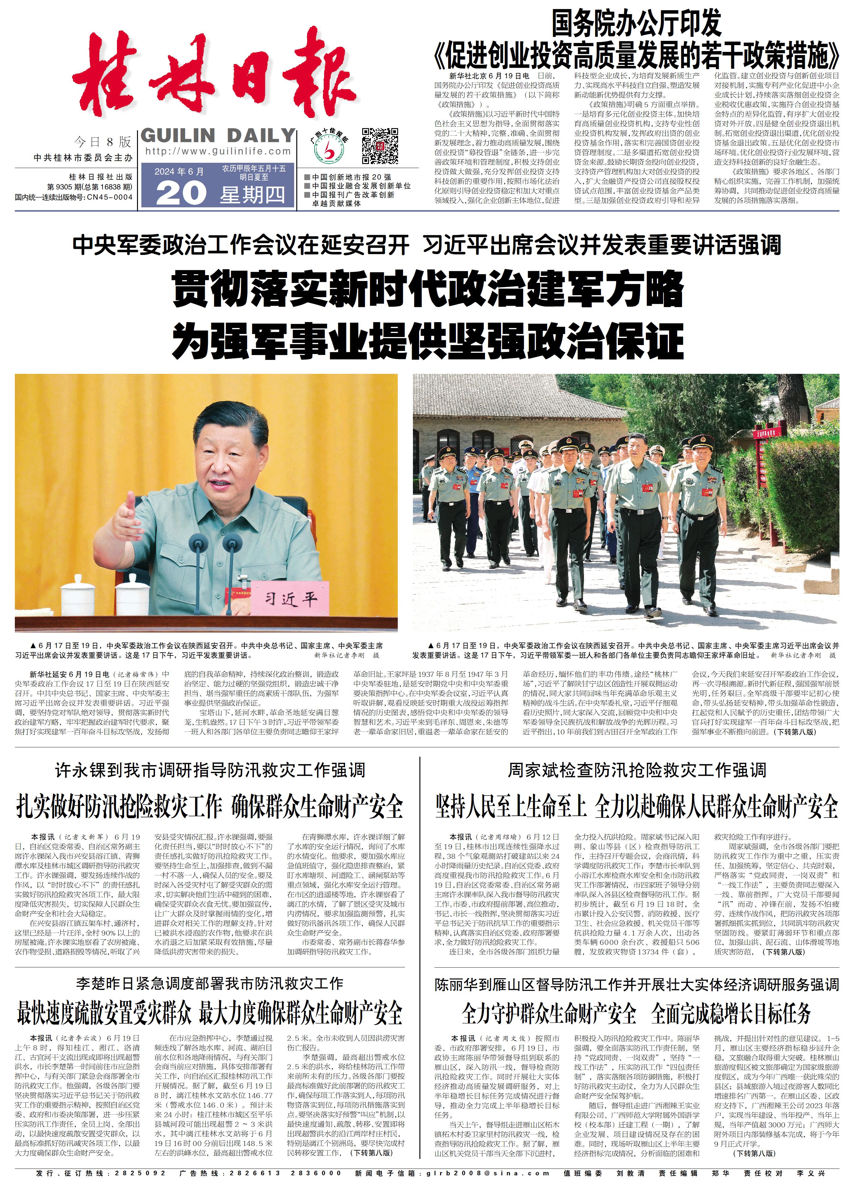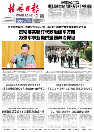 李楚强调,最高超出警戒水位2.5米的洪水,将给桂林防汛工作带来前所未有的压力。各级各部门要按最高标准做好此前部署的防汛救灾工作,确保每项工作落实到人,每项防汛物资落实到位,每项防汛措施落实到点。要坚决落实好预警“叫应”机制,以最快速度通知、疏散、转移、安置即将出现超警洪水的沿江两岸村庄村民,特别是漓江个别洲岛,要尽快完成村民转移安置工作,(下转第八版)