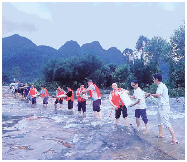 6月19日,因为暴雨,永福县三皇镇江头村东边㟖屯村民无法出行购买生活物品。镇政府干部和桂林银行职工共为该屯75户群众送去大米、方便面等生活物品。 韦文芳 摄