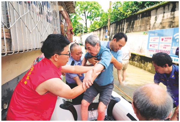 6月20日中午,消防救援人员用皮划艇将居民从积水严重的清风社区送出。 记者唐艳兰 摄