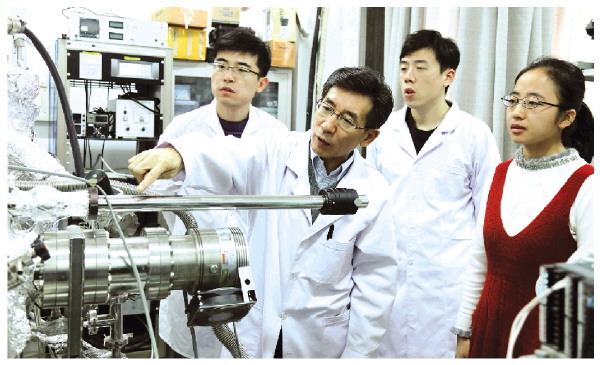2017年10月17日,薛其坤(前左)与学生在清华大学低维量子物理国家重点实验室讨论实验工作。 新华社发(石加东 摄)