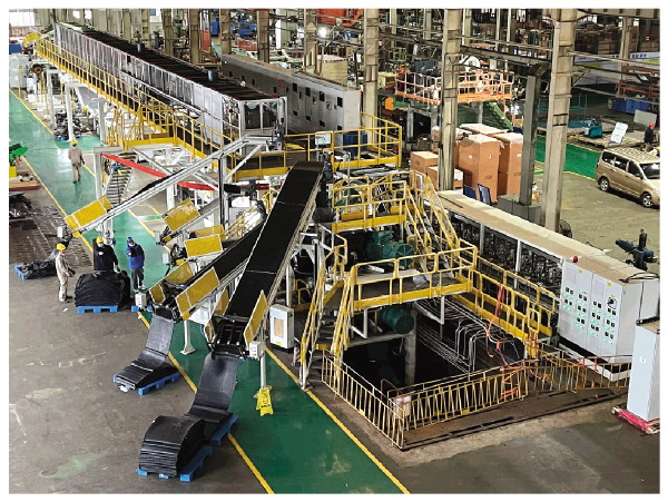 桂林橡胶设计院研发的五复合橡胶挤出生产线,是高端轮胎的半制品部件制备的核心装备,也是高端绿色轮胎最先进最关键的生产工艺装备,主要用于多种橡胶的加工、复合、定型。 (桂林橡胶设计院供图)