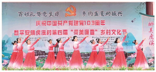 本报讯(记者何月 通讯员欧阳宇 俸玉昌)7月1日,恭城瑶族自治县平安镇虎溪村举办第四届“荷美廉香”乡村文化节。莲叶田田,清风送爽,在虎溪村新舞台,从舞蹈《党旗飘扬的地方》到快板《虎溪巨变感党恩》,精彩纷呈的文艺表演展现了虎溪村群众对党的热爱和对美好生活的向往,以新时代新面貌为中国共产党成立103周年献上祝福。