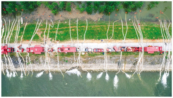 7月9日,在湖南华容县团洲垸洞庭湖大堤,排涝作业在进行中(无人机照片)。新华社记者陈思汗 摄