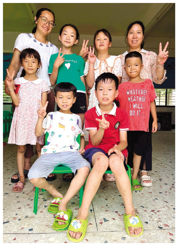 ◤“爱心妈妈”蒋文(后排左一)和朱建玲(后排右一)与孩子们合影。