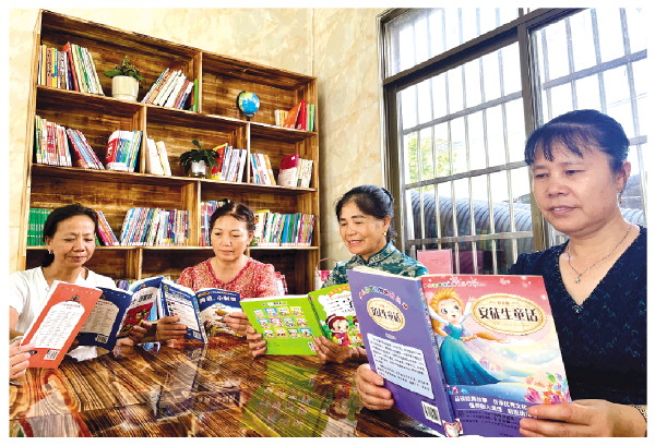 ▲蒋能玉(右一)带领爱心妈妈们熟悉孩子们阅读的书籍。
