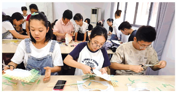 ▲小朋友们在制作竹扇。 记者刘菁 摄