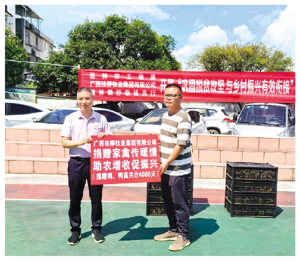 ◥近日,桂柳牧业集团向两江镇赠送鸡、鸭苗约4000羽,帮助脱贫户通过养殖家禽实现增收,巩固脱贫攻坚成果。图为捐赠现场。