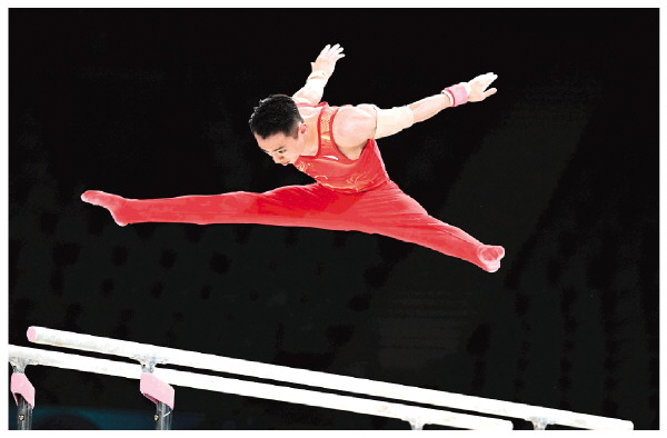 ▼7月24日,中国队选手邹敬园在进行双杠项目训练。 新华社记者程敏 摄