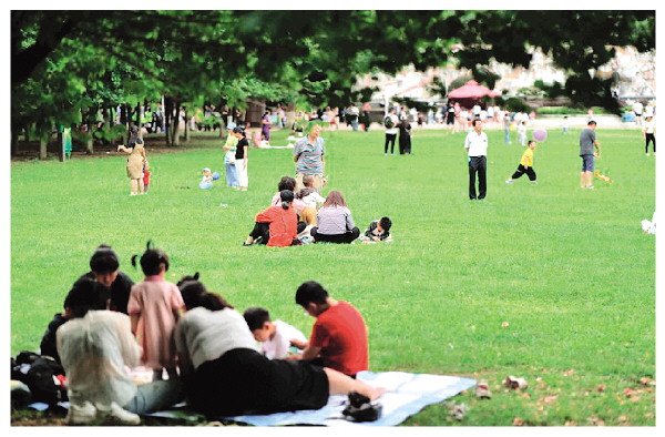 ▲公园草坪上,人人都在享受着绿地带来的闲适。 记者苏展 摄