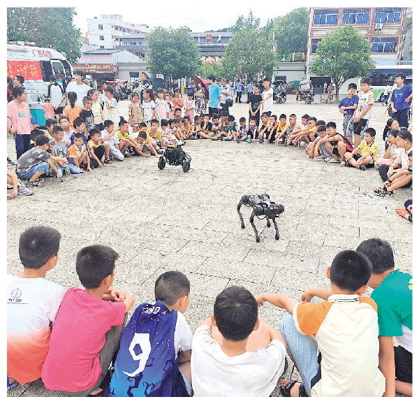 为普及科学知识,传播科学思想,激发和培育广大群众爱科学、学科学、用科学的热情,丰富青少年学生暑假生活,近日,全州县科协联合广西科技馆到石塘镇开展暑期科普志愿服务下基层活动。图为活动中群众和学生在围观人工智能机器狗和刑天机器人表演。邓琳 摄