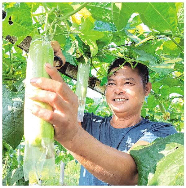 8月6日早上,蒋叶发在瓜田里采摘白玉丝瓜。 记者秦丽云 摄
