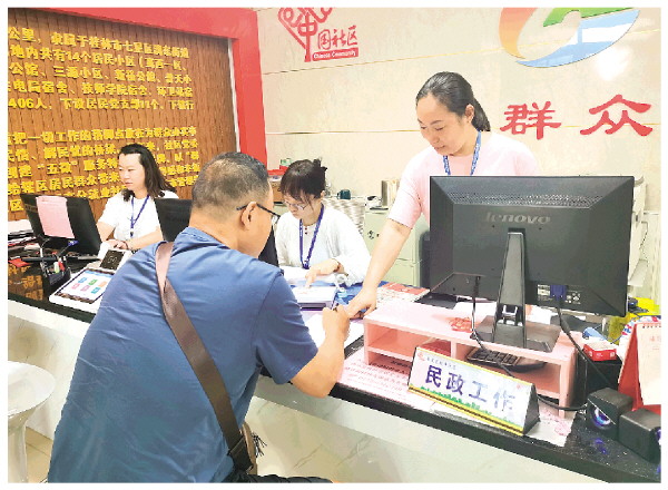 毅峰社区便民服务站的工作人员正在为市民办理相关业务。 记者徐莹波 摄