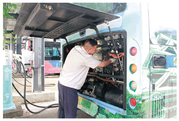 公交车司机胡天顺在仔细保养他驾驶的新能源公交车。记者黄敏 摄
