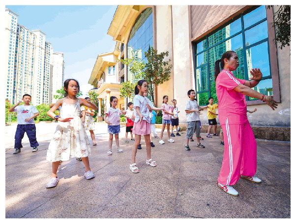 8月7日,在长沙市望城区月亮岛街道黄都港社区,小朋友跟着志愿者练习太极拳。