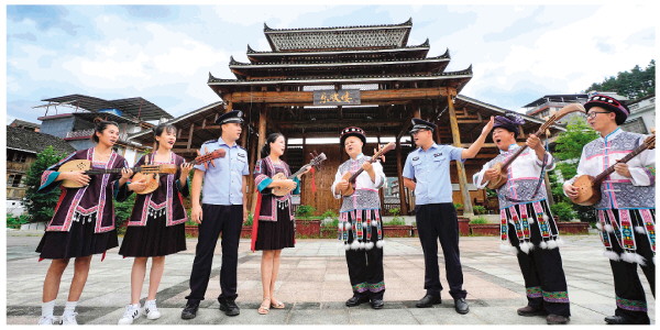 “歌声起来山花开,欢迎你到侗寨来。今天来说电诈呀,不转账就把钱保……”7月12日,在龙胜各族自治县乐江镇鼓楼前,民警跟侗族群众一同“嘎琵琶”,对唱反诈琵琶歌。
