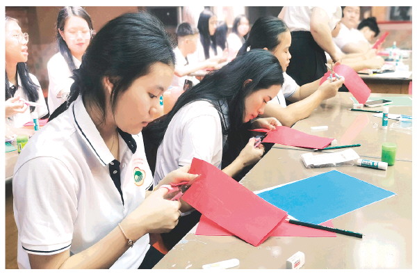 ▲学生们现场体验中国剪纸制作。