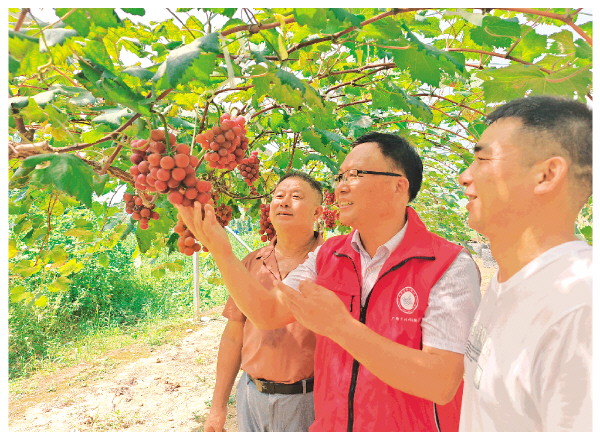 ▲近日,全州县水果部门技术员在种植基地查看妮娜皇后葡萄挂果及着色情况。
