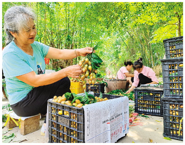 在杨堤乡上龙村,金灿灿的黄皮果挂满了枝头。农户们正忙着采摘、搬运、分拣、装箱,力争每一颗黄皮果都能以最佳状态“抢鲜”上市,呈现在消费者的面前。杨堤乡上龙村的村民沈先发也在自己的果园里忙碌着。“今年我们杨堤上龙村的黄皮果大丰收,我们家里种了十二三亩,每一亩大概有4000斤,今年的收购价格平均22元每公斤。”他高兴地说道。