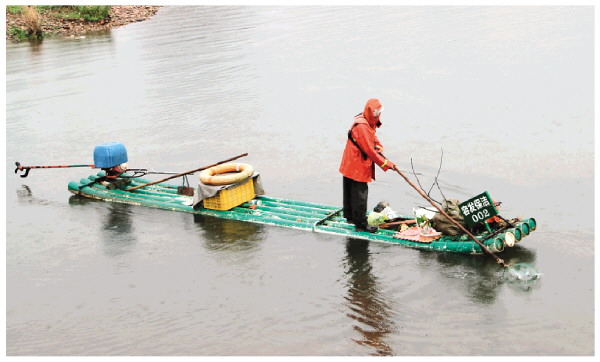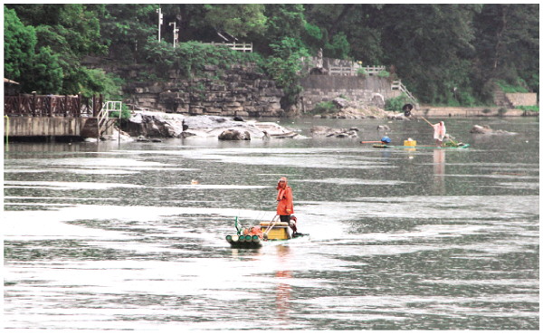 江面保洁员熟练地操纵着竹筏,穿梭在碧波之上。