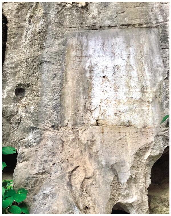图①:位于龙隐洞北出口峭壁上的周去非等人的题名石刻。