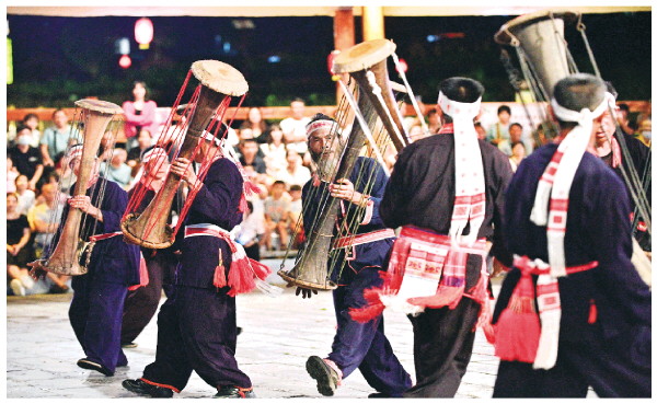 ◥8月24日,表演者在金秀瑶族自治县长垌乡平道村古占屯为游客展示国家级非遗项目黄泥鼓舞。